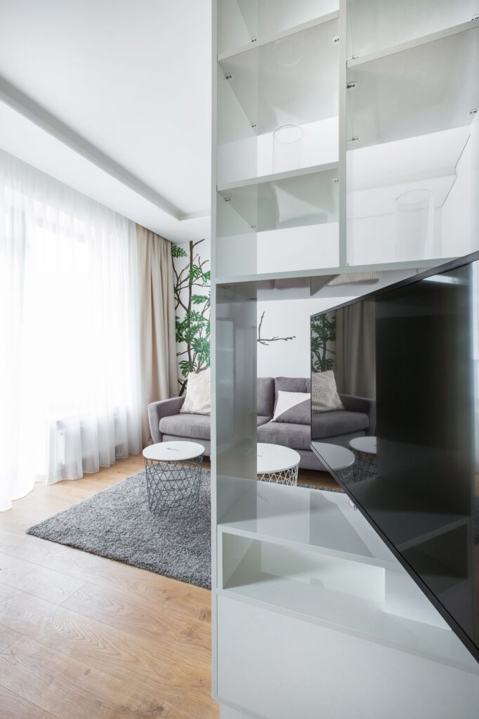 Šiame interjere poilsio ir valgomojo zonas subtiliai atskiria nestandartinė lentyna su integruotu, apsukamu televizoriumi.