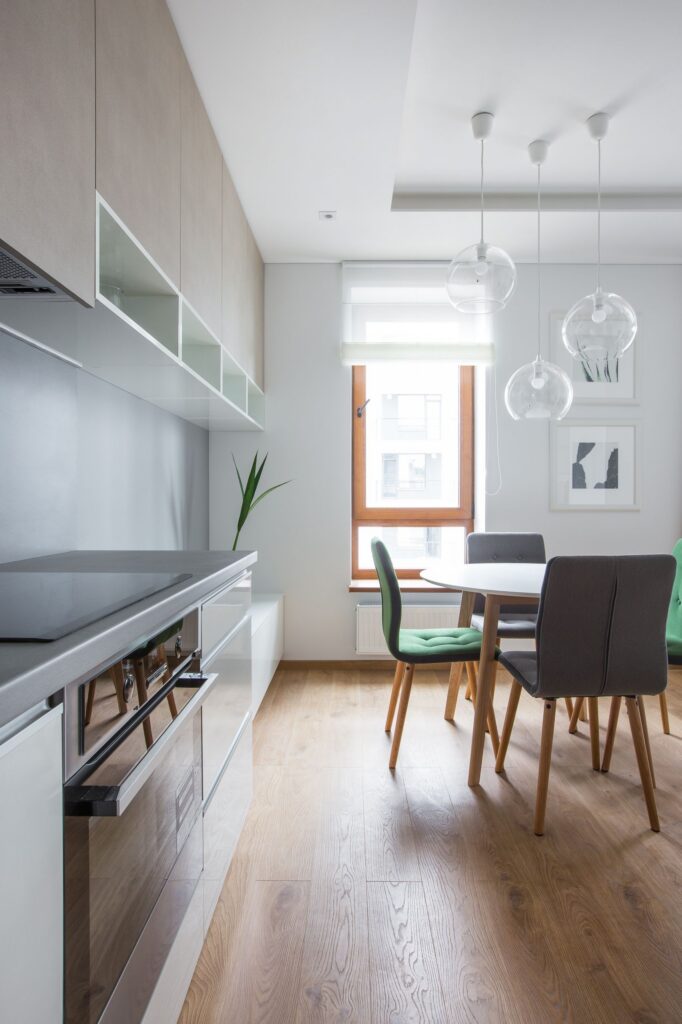 Šalia virtuvės įkomponuota valgomojo zona su apvaliu stalu ir sodriai žalios spalvos kėdėmis tampa kontrastingu, bet darniai derančiu akcentu, suteikiančiu visai erdvei gyvybingumo. Tai virtuvė, kurioje paprastumas susijungia su funkcionalumu, o estetika – su kasdieniu patogumu.