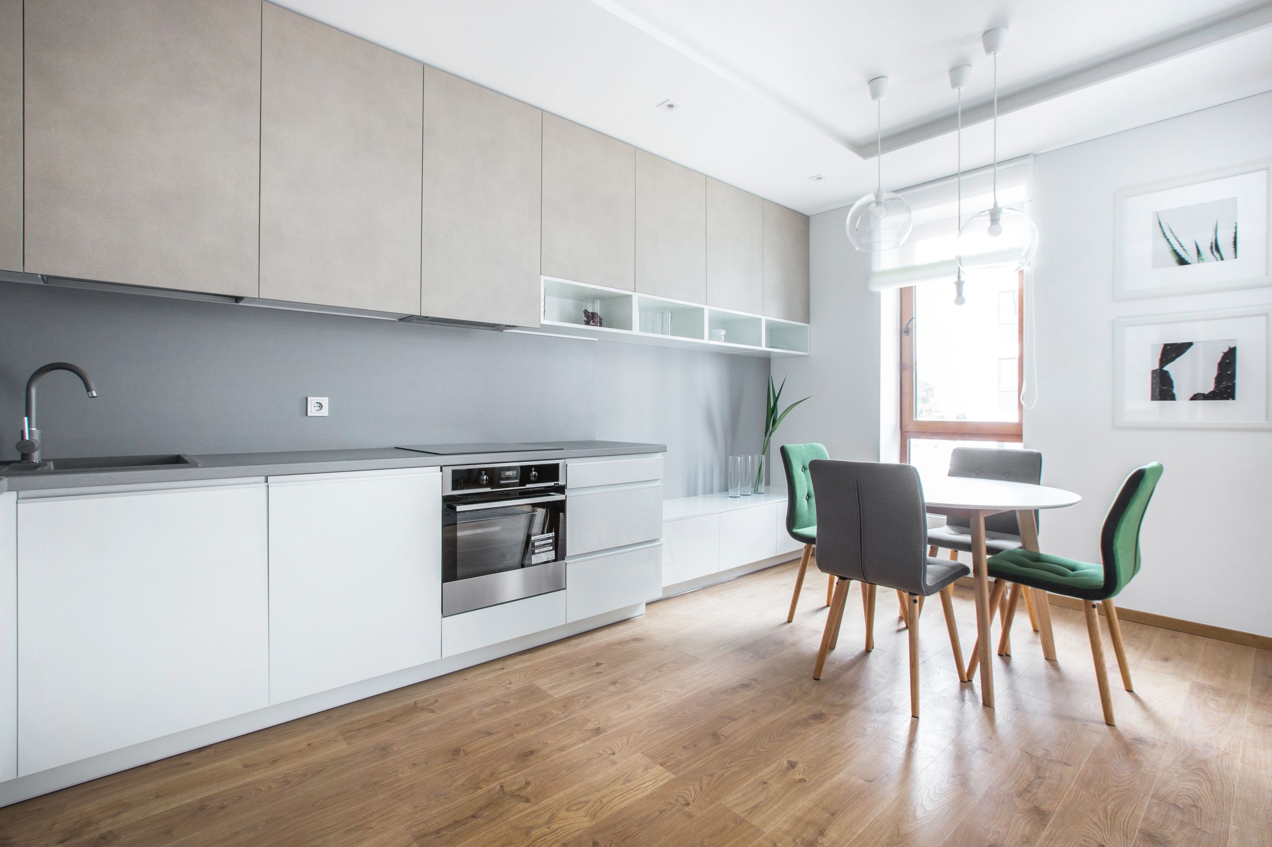Šalia virtuvės įkomponuota valgomojo zona su apvaliu stalu ir sodriai žalios spalvos kėdėmis tampa kontrastingu, bet darniai derančiu akcentu, suteikiančiu visai erdvei gyvybingumo. Tai virtuvė, kurioje paprastumas susijungia su funkcionalumu, o estetika – su kasdieniu patogumu.