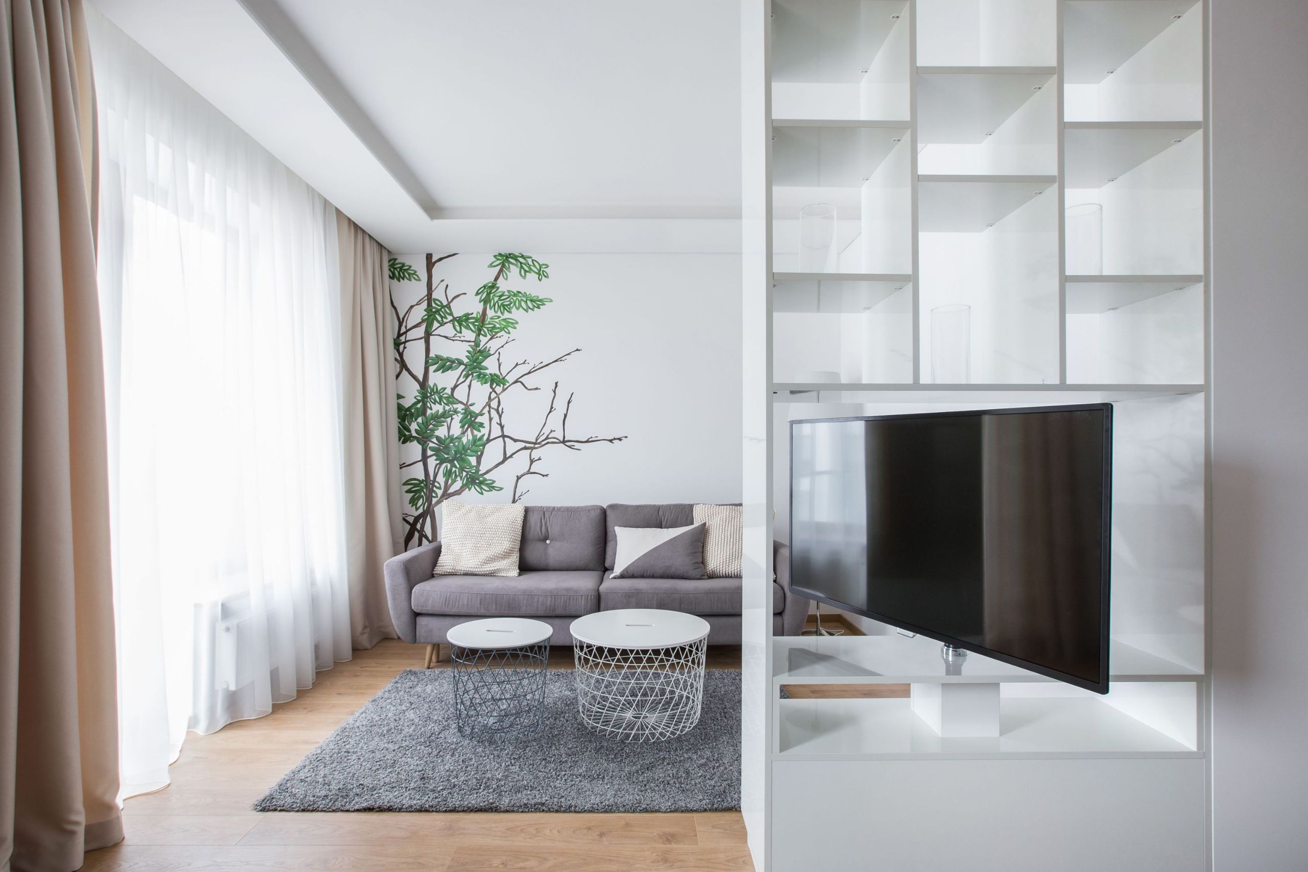 Šiame interjere poilsio ir valgomojo zonas subtiliai atskiria nestandartinė lentyna su integruotu, apsukamu televizoriumi.