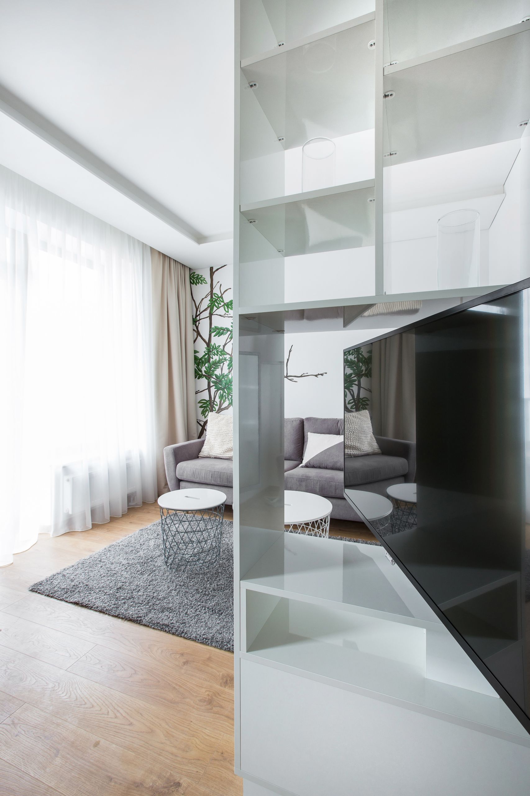 Atvira lentynos struktūra leidžia šviesai laisvai sklisti, todėl erdvės išlieka šviesios ir vizualiai nesumažintos, o tuo pačiu suteikia vietos dekoratyviniams elementams. Televizorius gali būti lengvai pasuktas į svetainę ar valgomojo pusę, priklausomai nuo poreikio, todėl šis baldas tampa itin praktišku kasdienybėje.