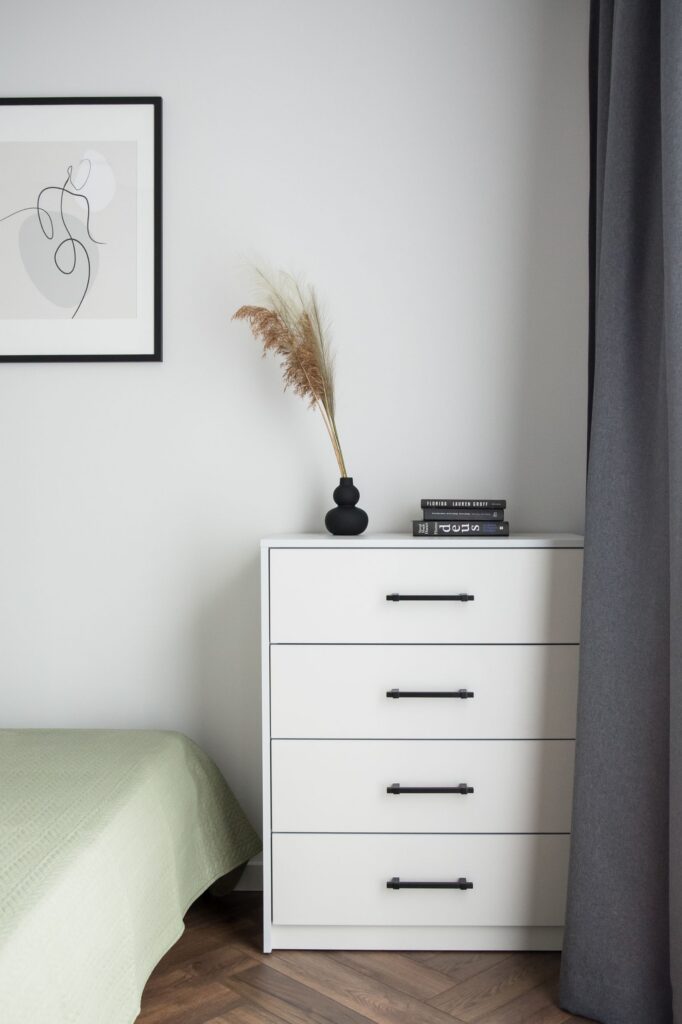 Miegamajame vyrauja ramybės ir minimalizmo estetika. Čia atsikartoja visame bute naudojamos medžiagos bei detalės, todėl erdvė natūraliai siejasi su kitomis namų zonomis. Integruota spinta bei komoda suteikia pakankamai vietos daiktams, tačiau neapsunkina kambario – baldai susilieja su sienomis ir kuria lengvumo pojūtį. Taip erdvė išlieka tvarkinga, vizualiai lengva ir leidžia atsipalaiduoti.