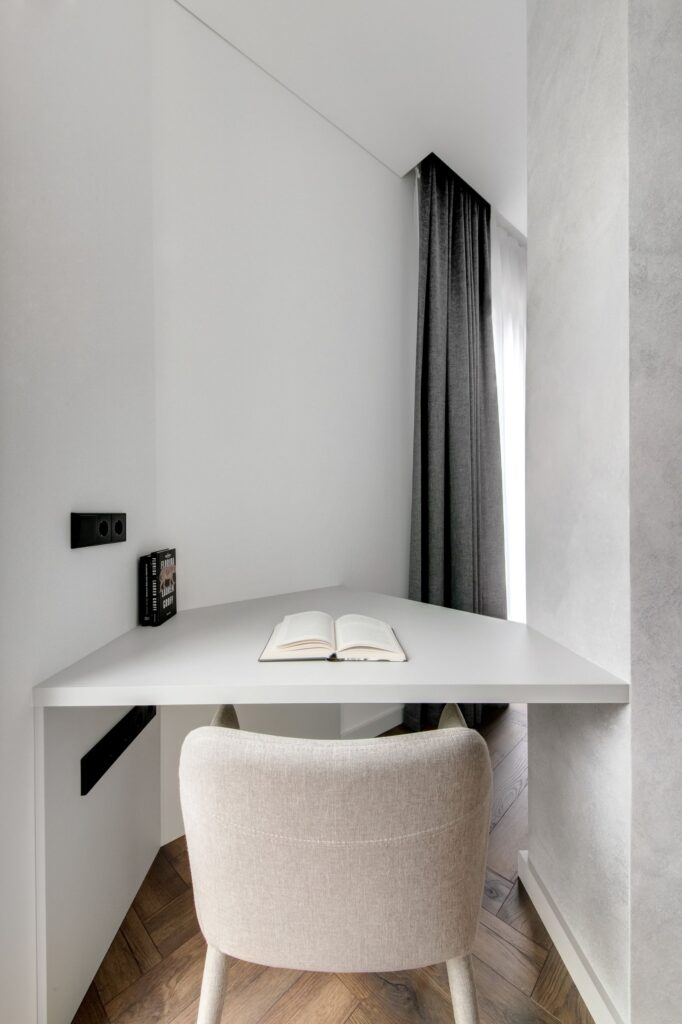 Šio buto architektūrinė forma – neįprasta, todėl ypač svarbu buvo išnaudoti kiekvieną kampą. Baldai pritaikyti individualiai, atsižvelgiant į nestandartines sienų linijas ir nišas. Niša už kolonos tapo ne problema, o galimybe – čia integruotas kompaktiškas darbo stalas, idealiai įsiliejantis į erdvę. Stalviršio forma pritaikyta taip, kad neliktų neišnaudotų plotų.