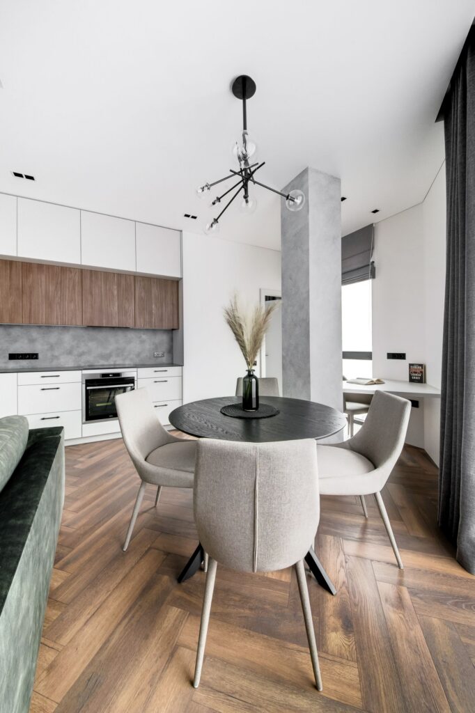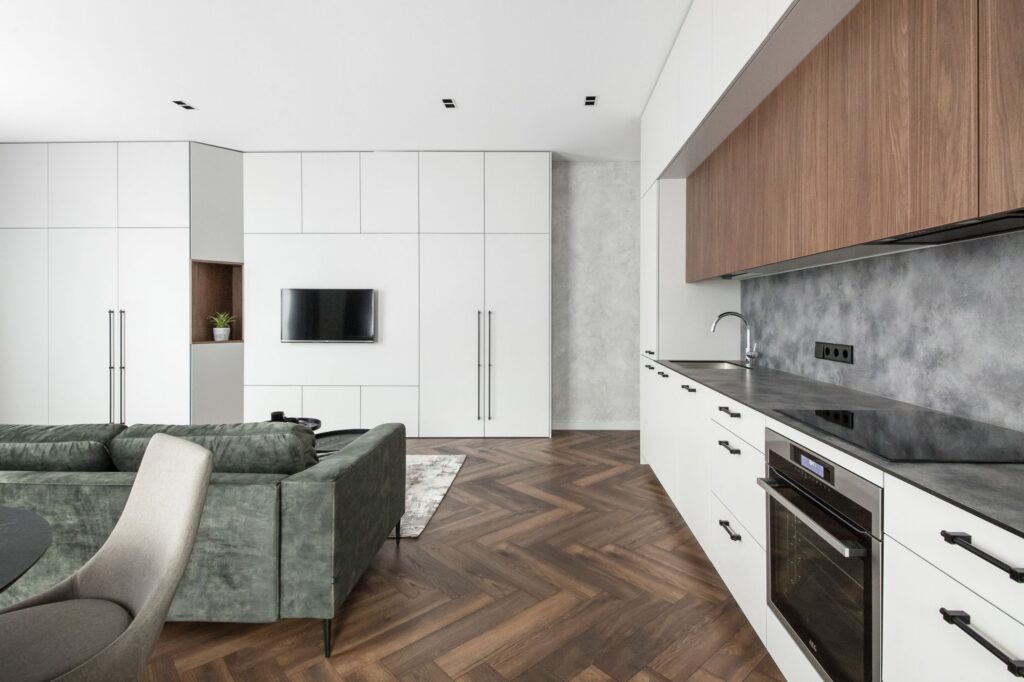 Bendra virtuvės, svetainės ir valgomojo erdvė sukurta taip, kad kiekviena zona turėtų savo funkciją, bet kartu išlaikytų darnią visumą. Integruotos sieninės spintos ne tik suteikia daug vietos daiktų laikymui, bet ir tampa pagrindiniu interjero akcentu – jų švarios linijos bei paslėptos funkcijos leidžia erdvei išlikti minimalistinei ir tvarkingai.
