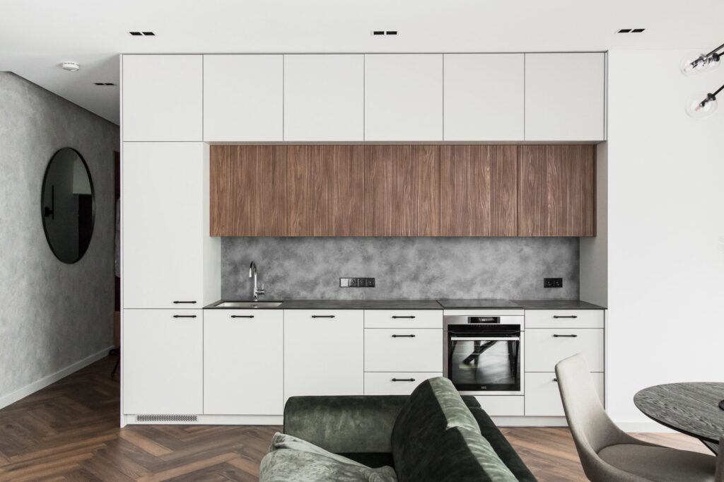 Šioje virtuvėje vyrauja minimalistinis dizainas, kuriame švarios baltos linijos dera su natūralaus medžio rašto fasadais. Betoną primenanti sienų apdaila suteikia modernumo, o juodi rankenėlių akcentai subtiliai išryškina baldų formas. Įmontuota buitinė technika ir simetriškas išdėstymas kuria tvarkos bei vientisumo įspūdį. Tai virtuvė, kurioje estetika susijungia su praktiškumu – erdvė atrodo lengva, bet kartu išlieka funkcionali kasdieniam gyvenimui.